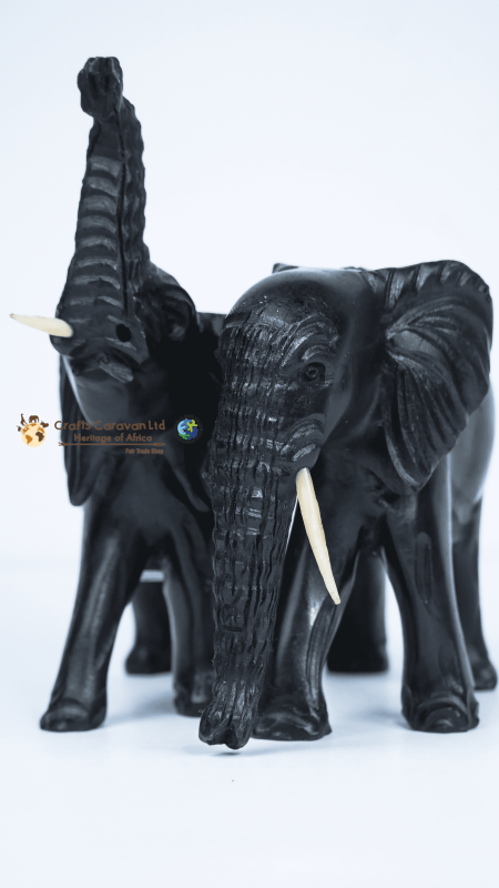 Black elephant figurine with trunk up. It is believed that an elephant trunk facing upwards will bring